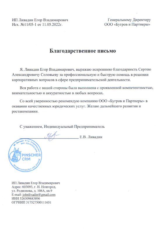 Благодарственное письмо от ИП Ливадин Егор Владимирович