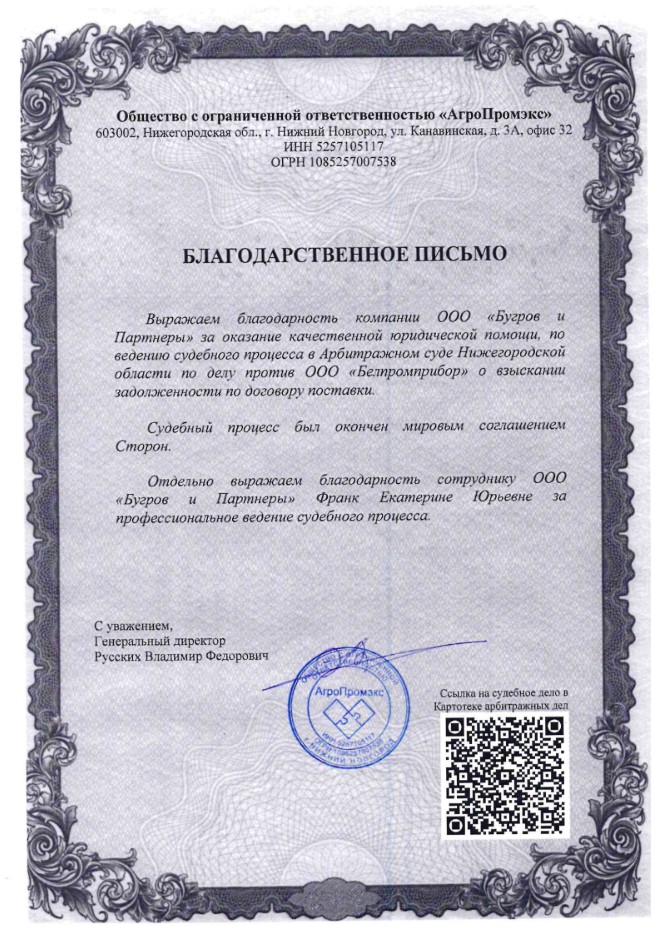 Благодарность юристам компании за профессионализм и оказание качественной юридической помощь