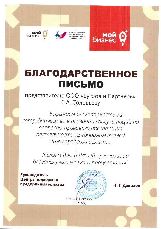 Благодарность за сотрудничество в оказании консультации по вопросам правового обеспечения предпринимателей Нижегородской области